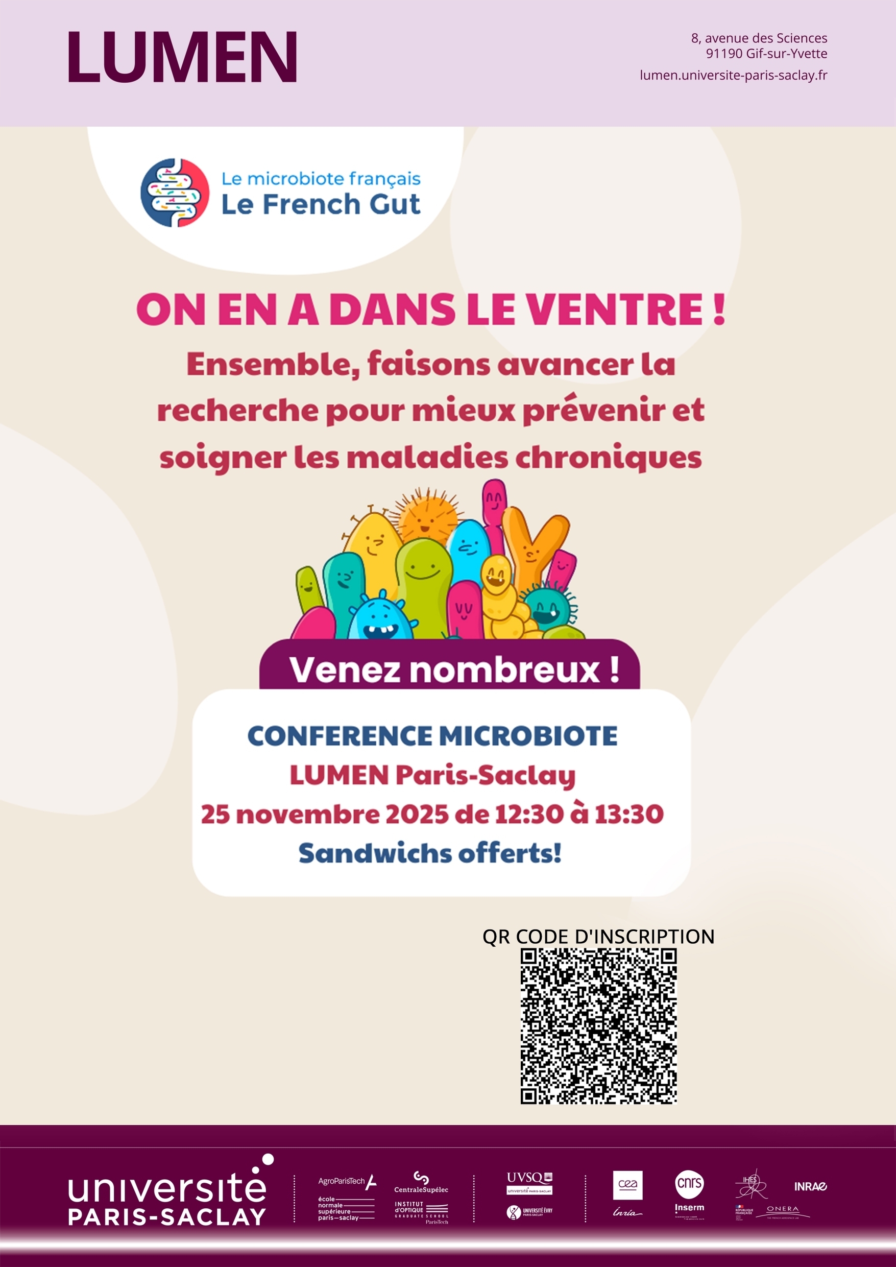 Dans le cadre de l’exposition sur les Sciences participatives au Lumen (Ensemble au cœur des sciences) du 07 novembre au 06 janvier 2026, nous valorisons un des projets de l’université « Le French Gut » à travers une conférence-sandwichs le mardi 25 novembre de 12h30 à 13h30. Les sandwichs sont offerts sur inscription (qui que vous soyez) et seront « microbiote-friendly », c'est à dire composés d'éléments bons pour le microbiote.